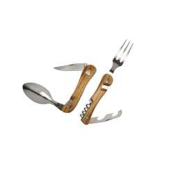 Foldbare bestik i fødevaregodkendt rustfrit stål 420. Håndtag i eksotisk asketræ. Magnetisk samling gør det nemt at dele produktet i to dele og danne en gaffel og en kniv (eller en ske).