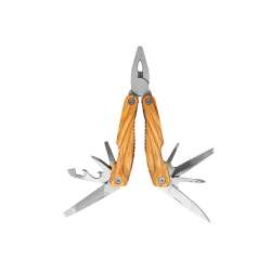 12 funktioner: universalklipper, afbiter, kniv, sav, fil, kapselåbner, dåseåbner, stjerneskruetrækker, 3 størrelser fladskruetrækkere, og punche.
