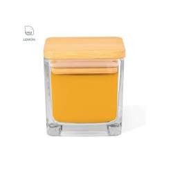 Aromatisk lys i klart glas med firkantet form og bambuslåg.