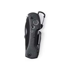 Multifunktionel kniv med tilbehør i rustfrit stål med sort finish. Grebet er lavet af slidstærk aluminium og har en praktisk karabinhage integreret i designet.
