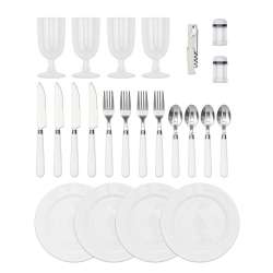 Inkluderer 23 praktiske tilbehør: 4 knive, 4 gafler, 4 skeer i rustfrit stål, 4 keramiske tallerkener (ø18 cm), 4 vinglas (18 cl), 1 flaskeåbner, 1 salt- og peberkværn.