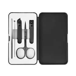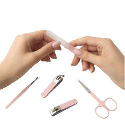 Sættet inkluderer en glasfil, to negleklippere i stål (en med skrå spids), neglesaks i rustfrit stål og ørepinde. Alt sammen præsenteret i en praktisk plastikæske.