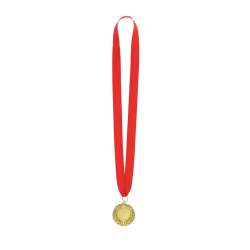 Medalje i metal med en flot, prægede guldfinish. Den kommer med et rødt polyesterbånd.