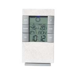 Vejrstation i hvede halm med termometer og hygrometer. Den viser tid, kalender, alarm og ugedag klart på det baggrundsbelyste display.